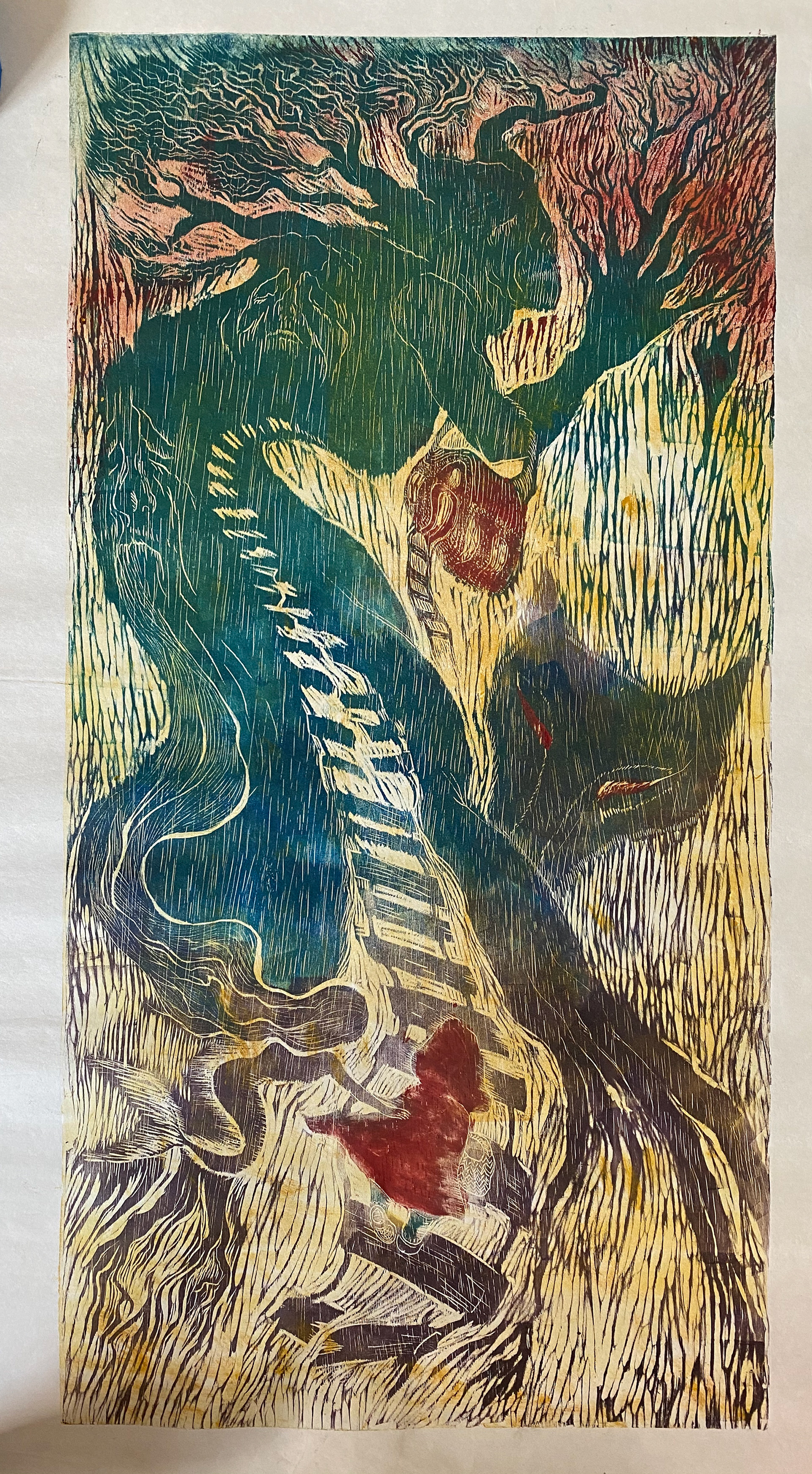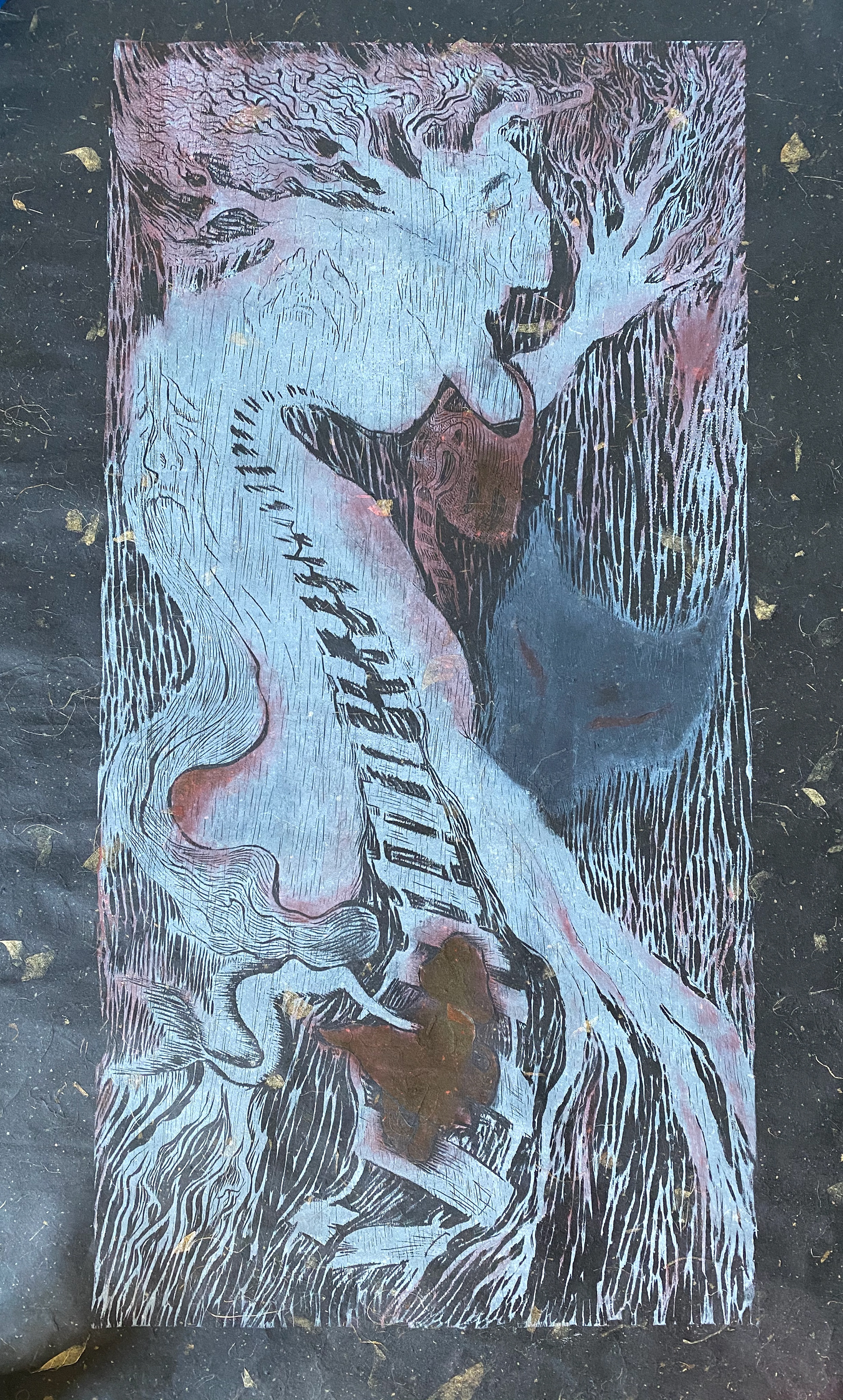 Woodcut on black paper.
